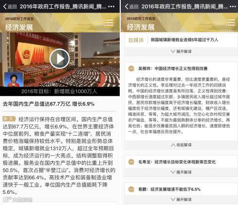 腾讯网从经济发展、住房保障、产业改革等八个方面解析政府工作报告,汇总相关方面的视频、文字内容,配合专业人士的解读,提升产品内容的深度。