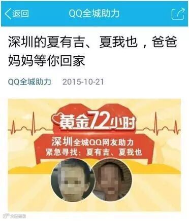 去年10月,深圳很多网民收到了来自QQ全城助力公众号的紧急寻人推送:一家两男孩结伴出门后失踪,3天都没找到。其实,这是腾讯调动了便于客户投放广告的移动互联网用户地理信息技术。通过大数据计算,可以将走失信息推送给那些身处相关区域的网民,让更有可能看到男孩的人行动起来。最后,这条启事转发超10万次,并成功地通过3名网友提供的线索,找回了兄弟俩。