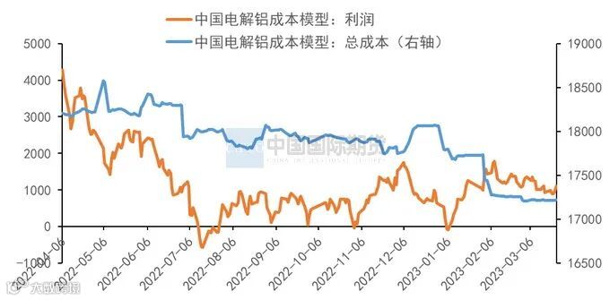 电解铝生产需要持续稳定的电力供应和氧化铝供给。2月中国电解铝行业加权平均完全成本16983元/吨,较上月下降286元/吨。铝价环比小幅上涨,电解铝2月行业平均利润环比上涨607元/吨。截至3月24日,中国电解铝即时完成成本为17218元/吨,即时盈利为1101元/吨。近期煤炭市场波动较大,国内主流电厂多以长协价格为主,成本相比波动较小,部分自备电厂目前煤炭库存尚可,以逢低补库为主。西南地区水电仍为枯水期电价,短期国内电解铝企业用电成本持稳运行。预焙阳极市场成本支撑松动,后期面临大幅回落的压力。整体来看,能源成本持稳的情况下,原辅料市场表现疲弱可能带动电解铝成本走低,关注新一轮预焙阳极等市场的定价。