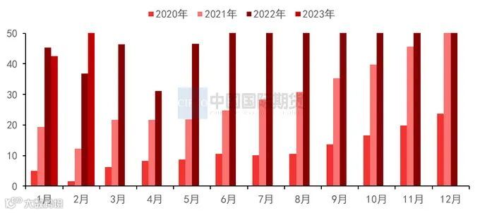 结合国内电解铝社会库存表现来看,自1月以来呈现持续累库状态,2月月度库存增加22.1万吨,但2月底累库节奏明显放缓。临近3月中旬,电解铝锭已连续两周去库,拐点显现。截至3月23日,国内电解铝锭社会库存为112.6万吨,较一周前下滑8.5万吨,较2022年同期增加8.7万吨。近期电解铝锭库存连续去库,主因是到货量偏少,目前西南地区减产影响逐渐显现,使得库存降幅明显。出库方面虽随着下游消费好转,有所恢复,但对库存下降贡献的比例较小。随着季节性的恢复,预计电解铝库存将维持仍去库趋势。