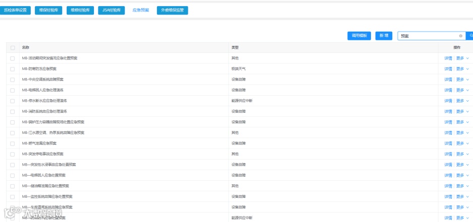 应急预案作为项目的经验沉淀,需要根据实践经验不断去更新完善,外滩设施建立的POMS平台设置了应急预案经验库,指导项目建立符合自身实际情况的应急预案,并可随时调用。