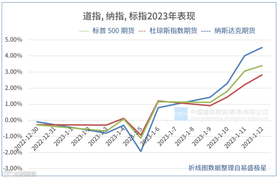 周四公布的消费物价指数,符合市场预期,但由于较早前市场是预期数据会较分析员预期更理想,所以数据公布后美股是不升反跌,之后市场渐渐取得共识,估计美联储2月加息1/4的机率由较早前的74%,上升至96%,简言之,消费物价指数数据虽没有惊喜,但仍保持向下势头,加强好友对美联储放慢加息的信心,因此,美股依然保持上升轨。