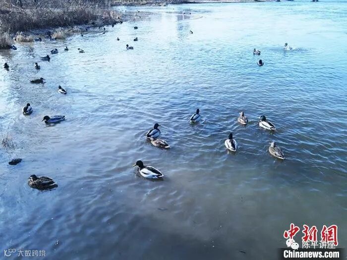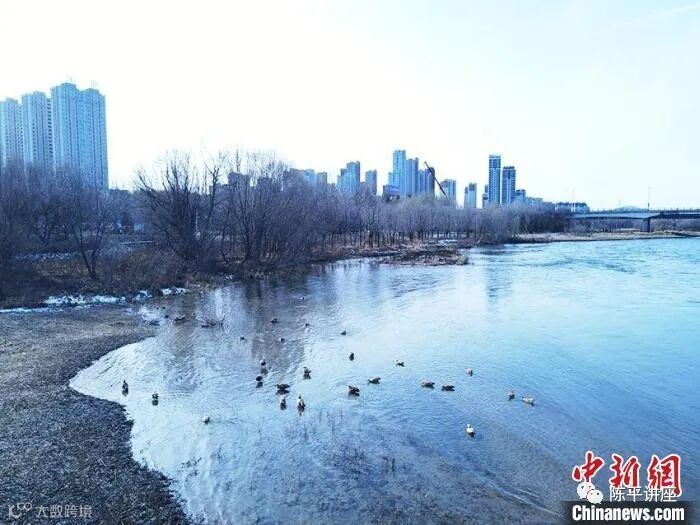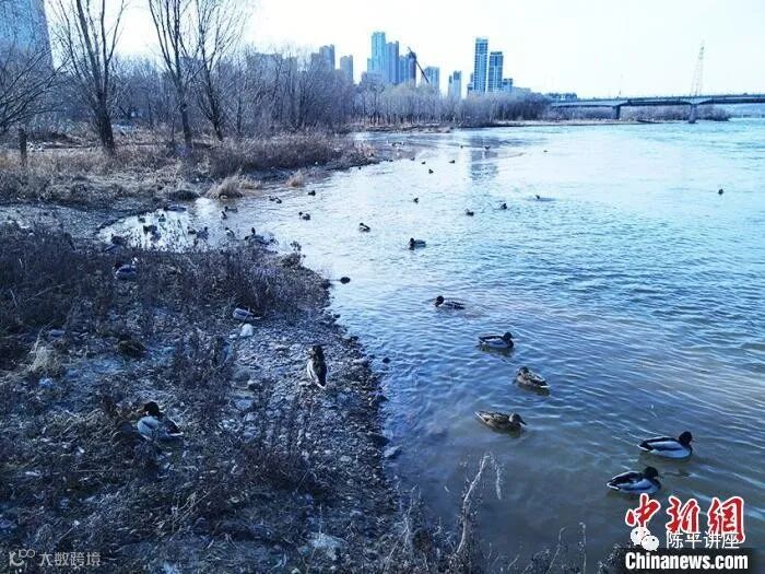 11月22日,小雪时节。在吉林市长白岛沿岸,千余只南迁候鸟在此筑巢安家。长年不冻的松花江流经吉林市,位于城区的长白岛每逢冬季都会迎来绿头鸭、赤麻鸭、秋沙鸭等南迁水鸟,它们在岛上悠然自得、嬉闹过冬。