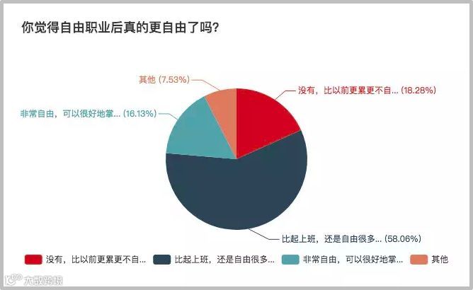 在你觉得“自由职业更自由了吗?”这个问题中,一半以上的人选择了“比起上班,还是自由很多”。