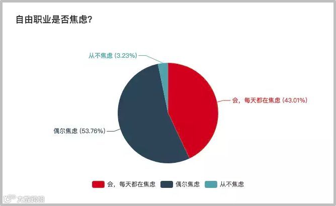在“自由职业是否焦虑”这个问题中,43%的人选择了每天都在焦虑,53%的选择了偶尔焦虑,只有3%的人从不焦虑。