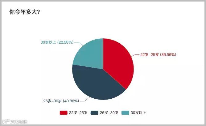 年龄分布:22-25岁 36.56%;26岁-30岁 40.86%;30岁以上 22.58%