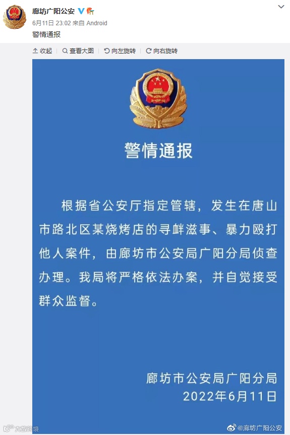 昨晚,11点02分,廊坊广安公安官方账号连夜宣布:根据省公安厅指定管辖,此案由廊坊广安分局侦查办理。
