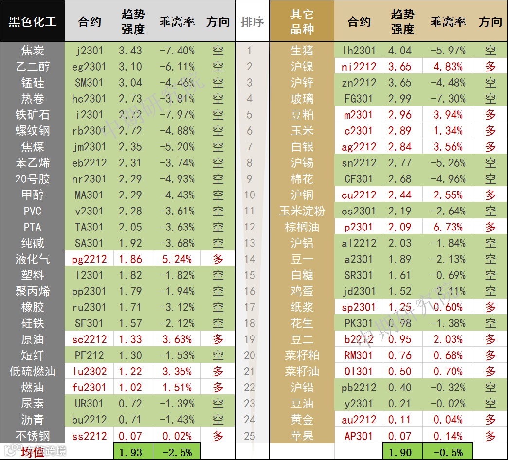 中期商品趋势榜 | 生猪空头排名持续居前(1101)