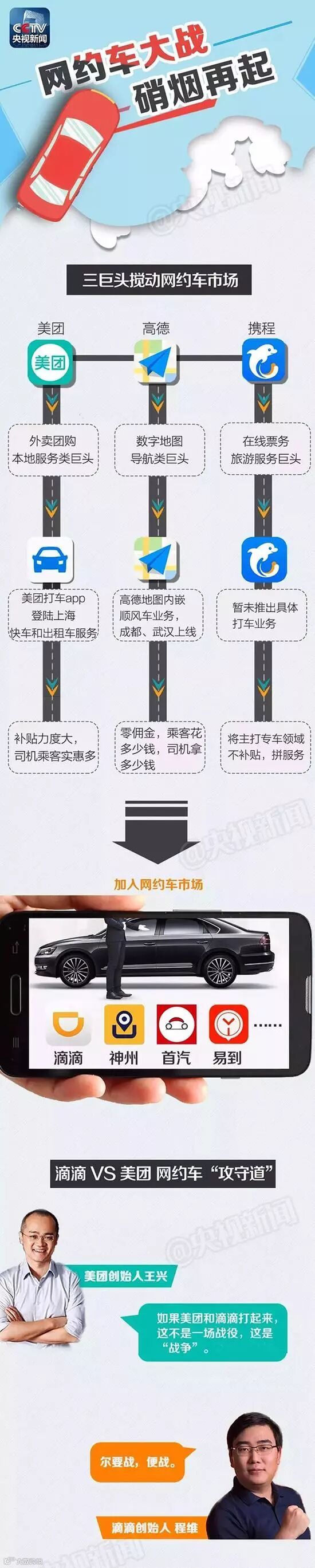 近日,美团、携程和高德地图相继高调进入网约车市场,欲与滴滴分庭抗礼。三家巨头为何会在此时纷纷“亮剑”?司机、乘客又在其中扮演怎样的角色?新一轮网约车大战要开始了,大家最关心的可能是补贴和优惠,其实,对于整个行业来说,补贴大战并不是长久发展之计。我们更期待看到网约车行业可以良性的发展。