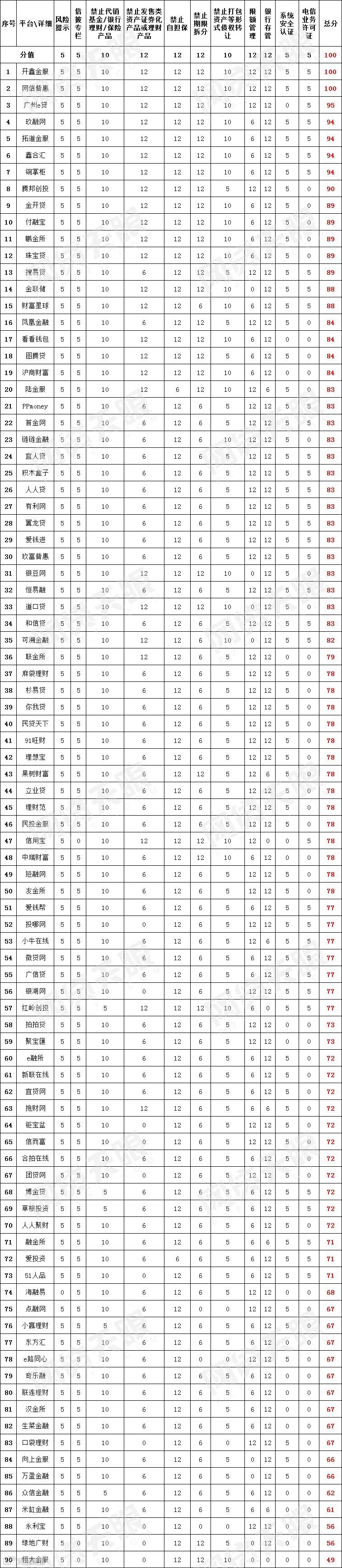 3、禁止代销基金/银行理财/保险产品指标10分。只要平台有销售基金或银行理财或保险产品本项指标得0分。如果平台将P2P业务和其他业务进行了拆分并进行独立运营,本项指标不扣分。