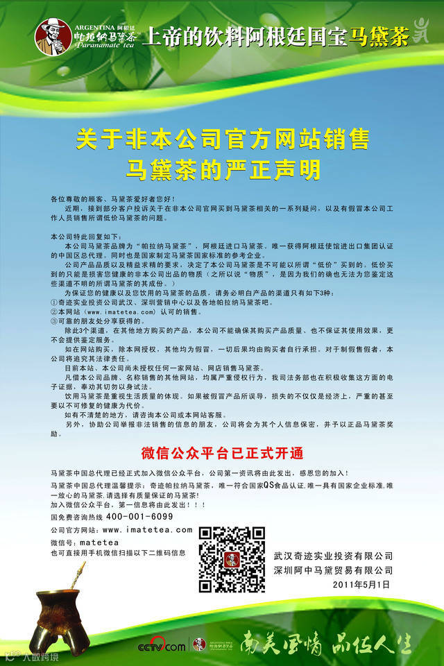 尊敬的全国各级帕拉纳马黛茶代理商及广大客户,您好!