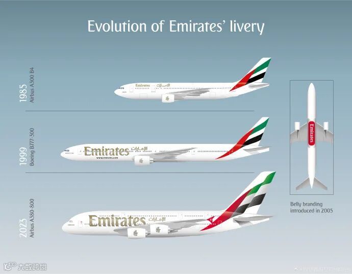 这是阿联酋航空官方飞机品牌颜色的第三次迭代。1985年该航空公司成立时推出的最初涂装,在14年后的1999年迪拜航展上,随着阿联酋航空第一架波音777-300的交付,首次进行了更新。