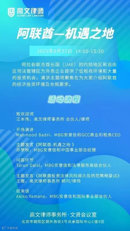 阿联酋(UAE)的内陆地区和自由区司法管辖区为外资企业提供了低税收环境和大量的投资机会。8月22日14:00-15:30,MBG将联合高文律师所在北京市朝阳区朝外西街3号兆泰国际中心C座9层举办“阿联酋—机遇之地”主题沙龙活动。本次演讲主题将聚焦在为大家介绍阿联酋的经济投资环境及合规要求。诚邀您的参加。