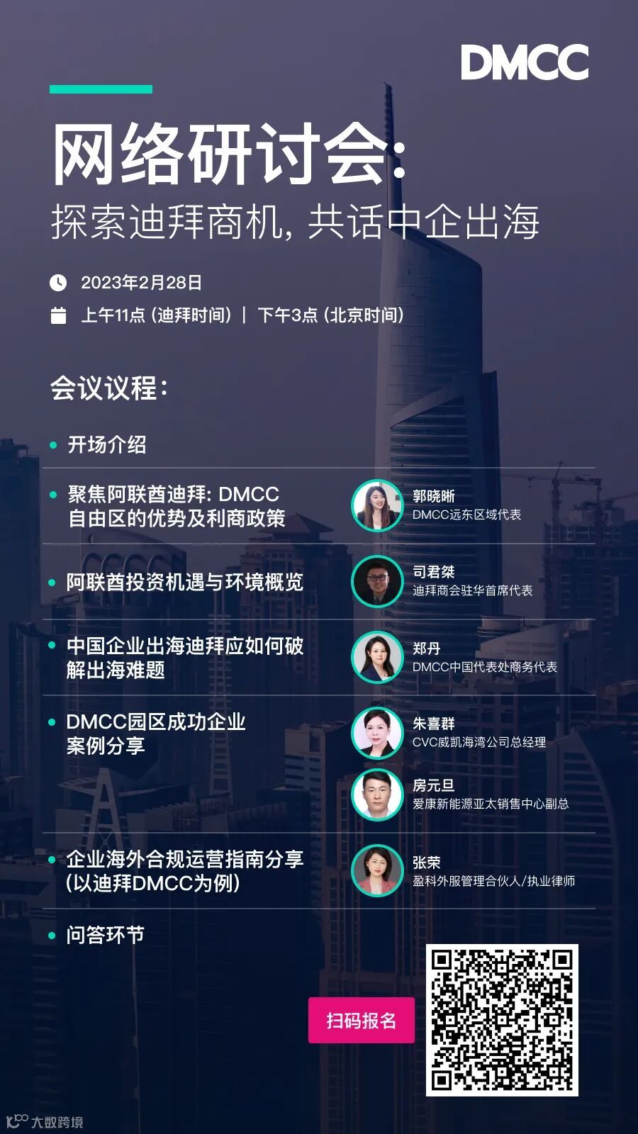 由DMCC主办的“探索迪拜商机,共话中企出海”主题中文网络研讨会将于2月28日举行,我们邀请了迪拜政企代表、知名中国企业及权威机构为您分享 “中企出海干货”,内容涵盖阿联酋迪拜投资机遇展望、企业出海前期注意事项及准备方向、出海后本地化与合规运营及税务法务实用指南。