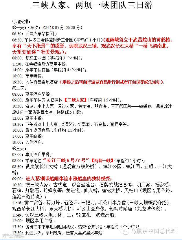 三. 活动项目:1.参观帕拉纳马黛茶武汉总公司包装分装车间及物流运输 2.游览三峡工程 (举世瞩目的三峡工程,是迄今世界上最大的水利水电枢纽工程,具有防洪、发电、航运、供水等综合效益)游览三峡人家 沿江旅游景点。