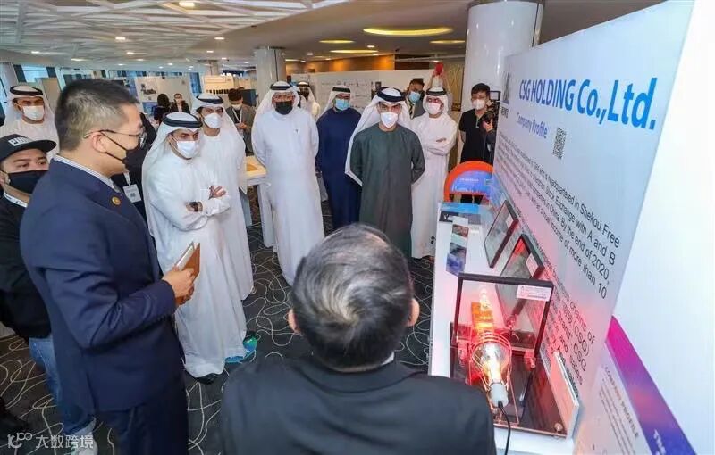 2022年迪拜世博会期间,由迪拜商会和深圳贸促委主办的“深圳精品展”在迪拜商会总部大楼展厅举办。活动期间,深圳南玻集团作为深圳重点企业,其负责人向阿联酋外贸部长萨尼·宰尤迪等一行介绍产品详情。