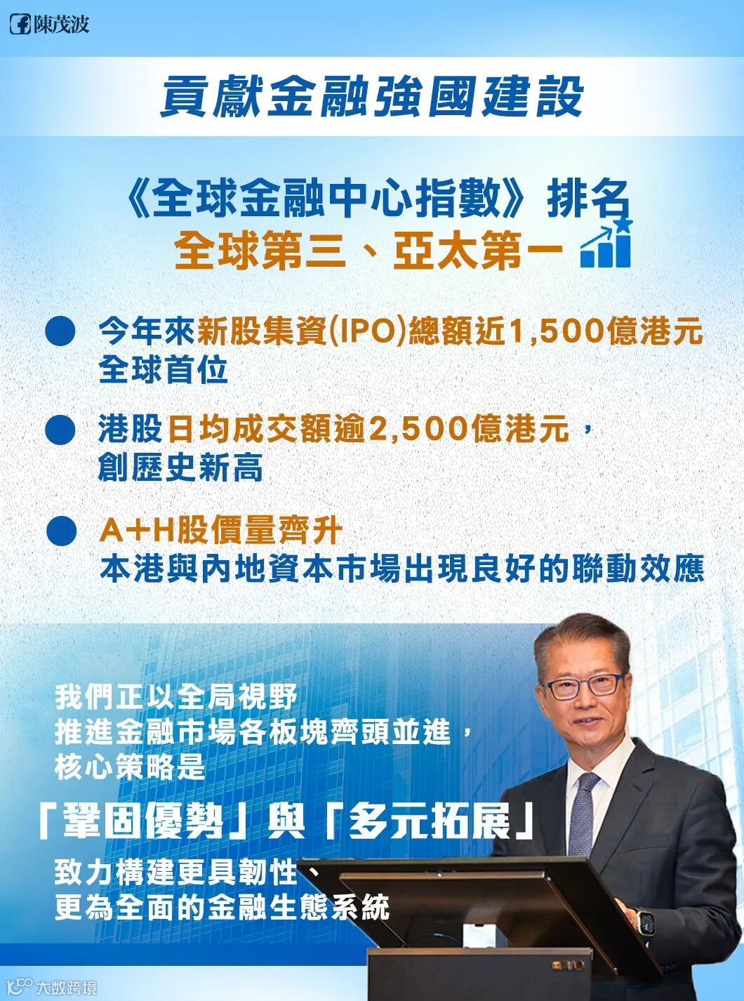 财政司司长陈茂波昨日于网志中引述最新公布的《全球金融中心指数》,指出香港继续位列全球第三、亚太区第一,并在「金融科技」、「营商环境」等多个领域位居全球首位,成绩令人鼓舞。