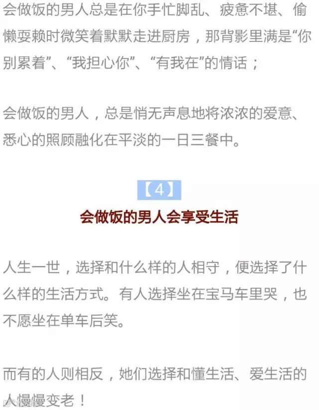所以,像张小娴说的那样:“拥抱一个爱做饭的男人,才是得到一张真正的长期饭票!” 和一个会做饭的男人,往往可以执子之手、携手白头!
