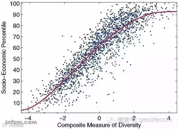 2010年,三个美国研究人员,Eagle,Macy和Claxton,做了一件有点惊人的事情来验证这个思想。他们把2005年八月整个英国的几乎所有电话通讯记录拿过来,涵盖90%的手机和超过99%的固定电话。这些电话记录构成了可见的社交网络。研究者很难知道每个人的经济状况,但是英国政府有全国每个小区的经济状况数据——你可以查到哪里是富人区哪里是穷人区。这样他们把电话通讯记录跟其所在的三万多个小区居民的经济排名对比。结果非常明显,越是富裕的小区,其交往的“多样性”越明显。但是这个结果如果细看的话还有更多有意思的东西。