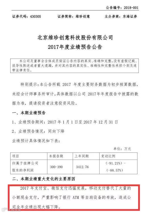 “2017年支付宝、微信支付迅猛发展,移动支付替代了大量的小额现金支付,严重影响了银行ATM等自助设备的布放,造成公司全年业绩出现大幅下降。”