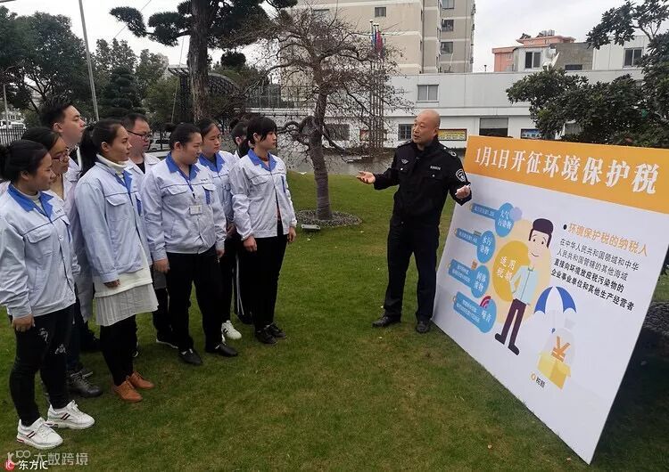12月28日,浙江省温州乐清市环保执法人员在城东街道一企业里宣讲“绿色税制”,做好环境保护税开征准备工作。(东方IC 图)