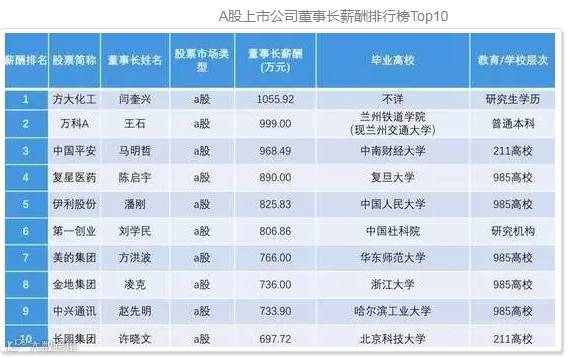 A股上市公司董事长薪酬前10中,除了没有披露院校的闫奎兴和毕业普通院校的王石,其他8位第一学历都是国内重点本科院校!