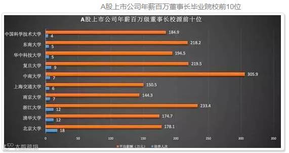 其实这也是可以理解的。北京大学培养的百万年薪的A股高管共计18位,富豪数量为全国高校之首,清华大学和浙江大学则以12位的高管数量排紧随其后,而在平均薪酬来看,中南大学以305.9万元的黑马之势在众高校中遥遥领先。