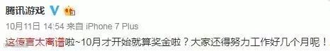 事后,@腾讯游戏的官方微博回复到:这传言太离谱啦~10月才开始就算奖金啦?大家还得努力工作好几个月呢!