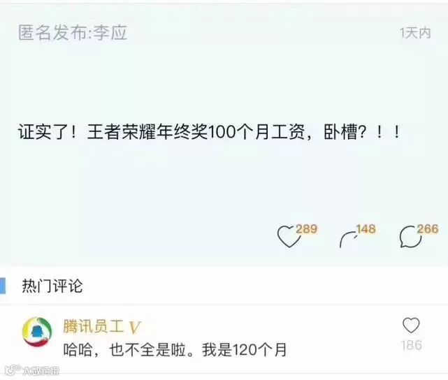 有匿名昵称为@李应 的网友在某社区发布留言称,“证实了!王者荣耀年终奖100个月工资”,表示惊讶。随后评论区有昵称为腾讯员工的网友回应称“哈哈,也不全是啦。我是120个月”。