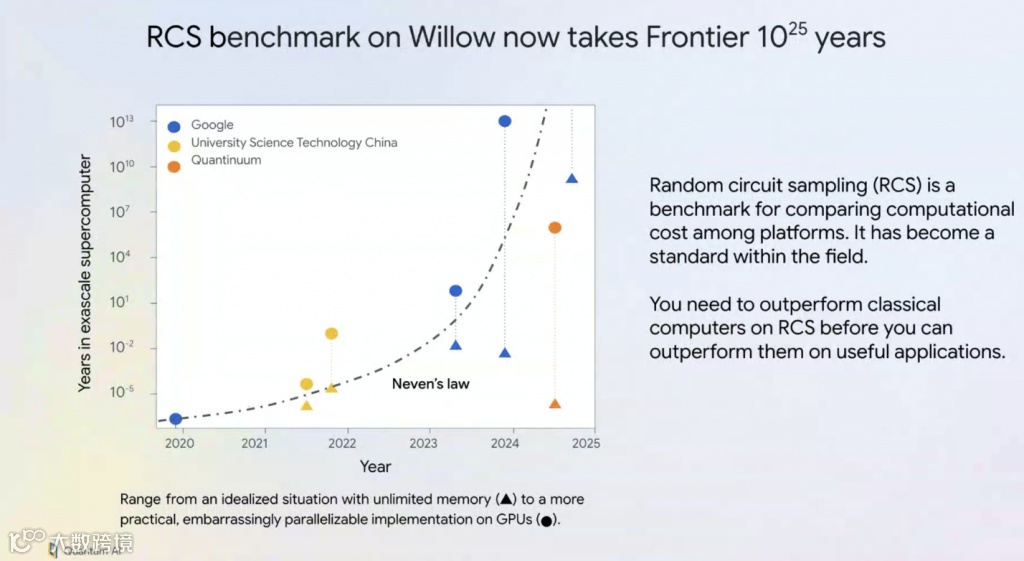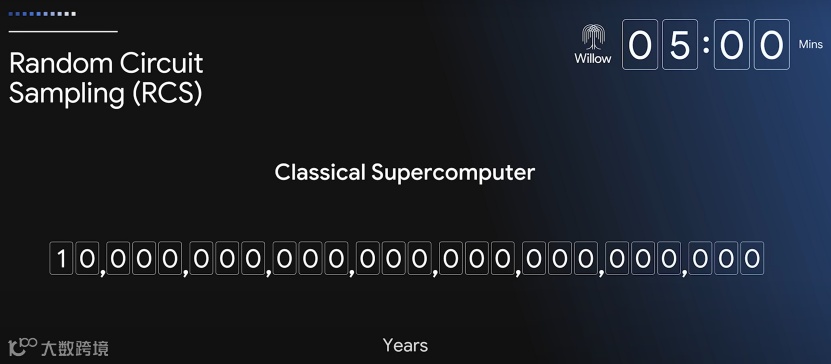 其次,Willow在五分钟内完成了一项标准基准计算,而当今最快的超级计算机之一Frontier完成同样的计算需要10的25次方(即10^25)年——是的,你没有看错,这个数字甚至远远超过了宇宙的年龄……