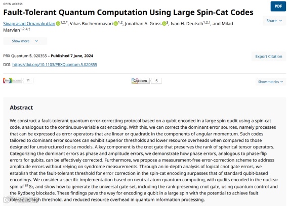 2024年6月,新墨西哥大学、Google Quantum AI在《PRX Quantum》期刊上发表题为“Fault-Tolerant Quantum Computation Using Large Spin-Cat Codes”(使用大自旋猫码的容错量子计算)的研究论文。研究团队使用自旋猫码,基于编码在大自旋高维量子比特中的量子比特构建了一个容错量子纠错协议,类似于连续变量猫编码。这种为主要错误源定制的纠错码可以表现出更高的阈值和更低的资源开销。此外,研究团队提出了一种免测量的纠错方案,可以在不依赖校验子测量的情况下解决振幅错误。这些发现为在大自旋中编码量子比特铺平了道路,有可能在量子信息处理中实现容错、高阈值和减少资源开销。
