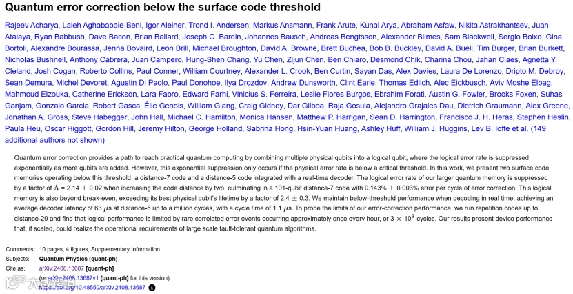 2024年8月,Google Research、马萨诸塞大学阿默斯特分校、Google DeepMind、加州大学圣巴巴拉分校、康涅狄格大学、奥本大学、苏黎世联邦理工学院、麻省理工学院、加州大学河滨分校、耶鲁量子研究所、耶鲁大学在arXiv平台发布题为“Quantum error correction below the surface code threshold”的研究论文(即12月9日的《Nature》)。研究团队提出了两个在该阈值以下运行的表面码内存:在72量子比特处理器中实现了一个集成了实时解码器的、码距为5的表面码,在105量子比特处理器中实现了一个码距为7的表面码。研究团队发现,当码距增加2时,更大量子内存的逻辑错误率受到错误抑制因子Λ=2.14±0.02的抑制。最终得到了由101个量子比特组成的、码距为7、纠错后错误率为0.143%±0.003%的表面码。码距为5的量子内存无法实现收支平衡,而码距为7的量子内存超过了盈亏平衡点,比其最佳物理量子比特的寿命高出2.4±0.3倍。为了探究纠错性能的极限,研究团队运行了码距为29的重复码,发现逻辑性能受到每小时(即3×10^9次循环)约发生1次成因尚未明确的罕见关联错误事件的限制。结果表明,如果对其进行扩展,设备性能足以实现大规模容错量子算法所需的运行要求。最后,研究团队证实,即便是实时解码,码距为5的72量子比特处理器也能够在保持低于阈值的状态下,实现可进行一百万次循环、循环时间为1.1μs、平均延迟为63μs的解码器。