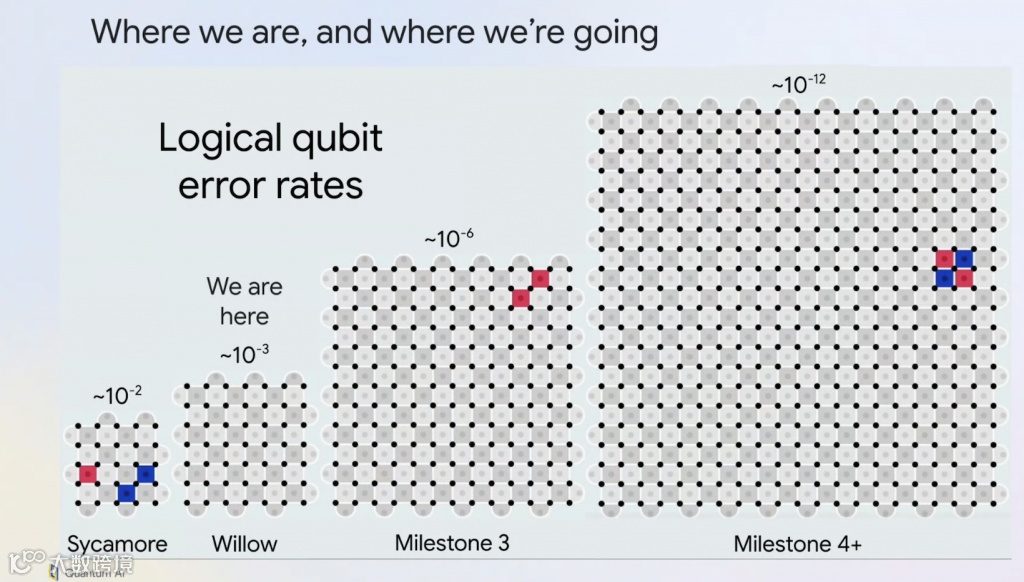 这些逻辑分组如下图所示,这些逻辑量子比特被称之为表面码。最左边是谷歌去年的“悬铃木”处理器,它的错误率是10的- 2次方,红色和蓝色的闪烁是检测到的错误。在Willow上,可以看到错误率在物理上提高了约两倍。在量子比特和操作提高两倍时,逻辑操作即编码量子比特,实际上提高了一个数量级以上——这是因为一旦超过这个关键阈值,处理器的微小改进会被量子纠错以指数级放大。所以当从左向右移动时,每次对量子比特数量的翻倍都会带来芯片性能的翻倍。谷歌表示,如果再进一步,可以达到第三个里程碑,即长寿命逻辑量子比特。