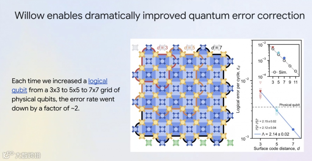 突破QEC阈值(随着量子比特数量增加,错误率反而降低)是量子计算领域长期追求的目标,这基本上证明了构建大型纠错实用量子计算机是可能的。
