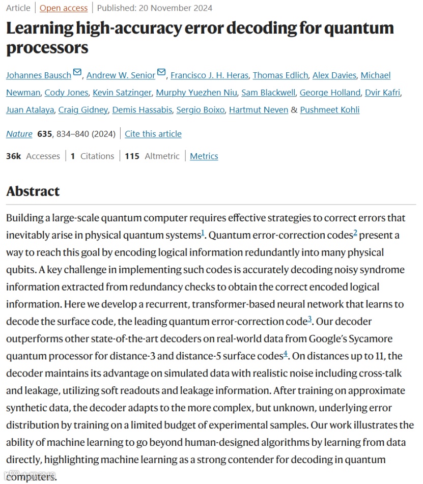 2024年11月,Google DeepMind、Google Quantum AI组成的研究团队在《Nature》期刊上发表题为“Learning high-accuracy error decoding for quantum processors”(用于量子处理器的高精度错误解码的机器学习)的研究论文。在本文中,谷歌的研究人员开发了一个基于transformer的递归神经网络,它学习解码表面码。解码器在处理来自谷歌的Sycamore量子处理器的真实数据时,在码距为3和码距为5的表面码方面优于其他最先进的解码器。在最远11的码距上,解码器利用软读取和泄漏信息,在具有真实噪声(包括串扰和泄漏)的情况下保持其在模拟数据上的优势。在对近似合成数据进行训练后,解码器通过在有限的实验样本预算上进行训练来适应更复杂但未知的潜在错误分布。该工作说明了机器学习通过直接从数据中学习来超越人类设计的算法的能力,突出了机器学习是量子计算机解码的有力竞争者。