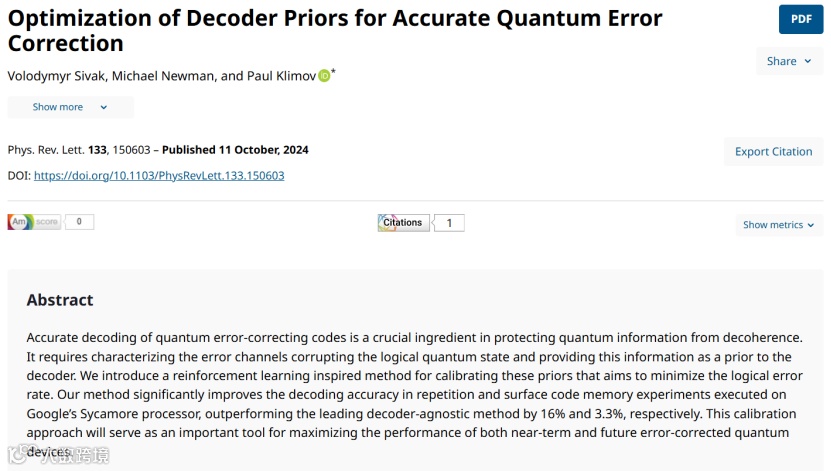 2024年10月,Google Quantum AI在《Physical Review Letters》期刊上发表题为“Optimization of Decoder Priors for Accurate Quantum Error Correction”(优化解码器先验以实现准确的量子纠错)的研究论文。研究团队通过引入一种受强化学习启发的方法,成功校准了解码器的先验,显著降低了逻辑错误率。在Google Sycamore处理器上进行的重复和表面码记忆实验中,该方法的解码精度分别提升了16%和3.3%,超过了现有的最佳无校准方法。这一成果为提高近期和未来量子设备的性能提供了重要工具,标志着量子纠错技术向实用化迈出了重要一步。