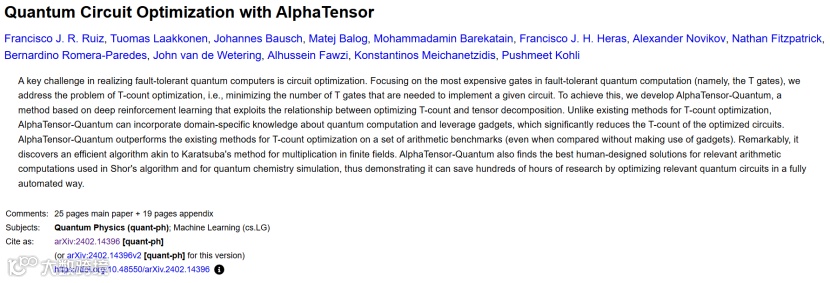 2月22日,Google DeepMind、Quantinuum、阿姆斯特丹大学在arXiv平台发布题为“Quantum Circuit Optimization with AlphaTensor”的研究论文。研究人员专注于容错量子计算中最昂贵的门(即 T 门),解决了 T 计数优化的问题,即最大限度地减少实现给定电路所需的 T 门数量。为了实现这一目标,研究人员开发了 AlphaTensor-Quantum,这是一种基于深度强化学习的方法,它利用了优化 T 计数和张量分解之间的关系。与现有的 T 计数优化方法不同,AlphaTensor-Quantum 可以整合有关量子计算的特定领域知识并利用小工具,从而显着减少优化电路的 T 计数。AlphaTensor-Quantum 在一组算术基准上优于现有的 T 计数优化方法(即使在不使用小工具的情况下进行比较)。值得注意的是,它发现了一种类似于 Karatsuba 的有限域乘法的有效算法。AlphaTensor-Quantum 还为 Shor 算法和量子化学模拟中使用的相关算术计算找到了最好的人工设计解决方案,从而证明它可以通过以完全自动化的方式优化相关量子线路来节省数百小时的研究时间。