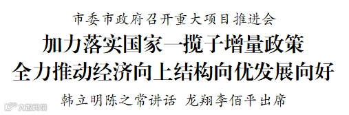 10月10日,市委市政府召开重大项目推进会,动员全市上下激发攻坚克难的冲劲、真抓实干的韧劲,全面贯彻9月26日中共中央政治局会议精神,加力落实国家一揽子增量政策,全力以赴完成全年目标任务,切实扛起勇挑大梁的责任担当。市委书记韩立明、市长陈之常讲话,市人大常委会主任龙翔、市委副书记李佰平出席。
