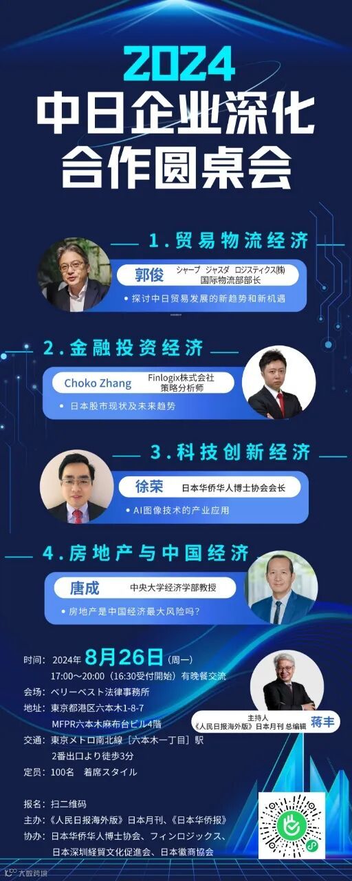 近年来,日元持续贬值,吸引了大量海外热钱涌入日本市场,外资在日本的房地产、旅游和半导体行业投资不断增加。同时,华侨华人企业在日本迅速崛起,成为推动中日经济交流与合作的重要力量。在此背景下,特举办“2024中日企业深化合作圆桌会”,共同探寻永续经营之道。