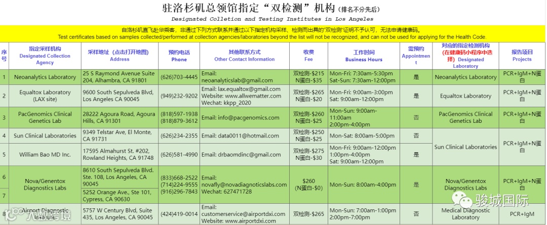 附2:洛杉矶总领馆指定双检测机构清单(点击查看大图 注:所列机构仅为洛杉矶区域,其他城市请查看对应城市的领馆公告)