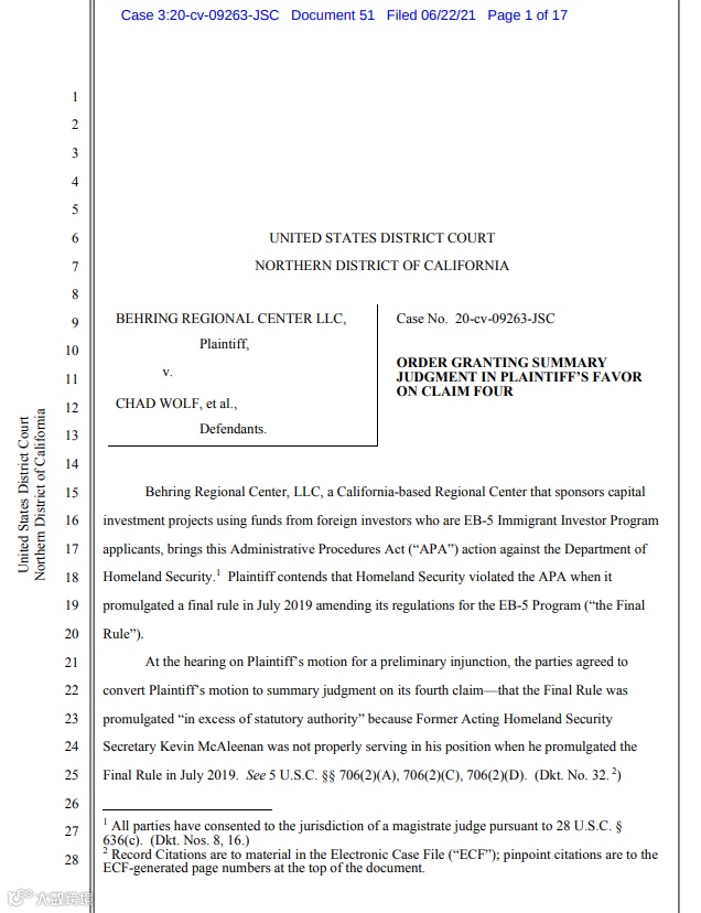 美国当地时间6月22日,美国加州北区联邦地方法院对EB-5涨价新规一案作出判决。EB-5涨价法规在2021年6月30日区域中心临时法案到期前被推翻,恢复至50万美金(TEA)及100万美金(非TEA)。