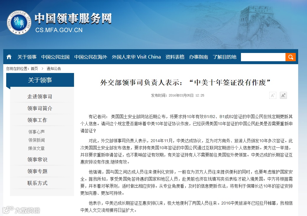 2014年11月12日,美国使领馆开始可以为前往美国从事商务和旅游活动(B1/B2)的中国公民颁发有效期最长为10年的多次入境签证。
