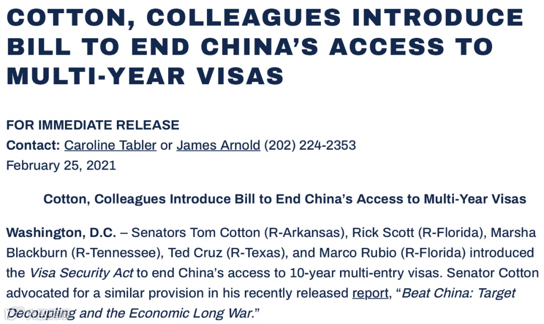 美国共和党参议员Tom Cotton交了份法案(Visa Security Act),提议取消中美往返10年签证,恢复2014年前的签证状态,允许1年多次往返中美。