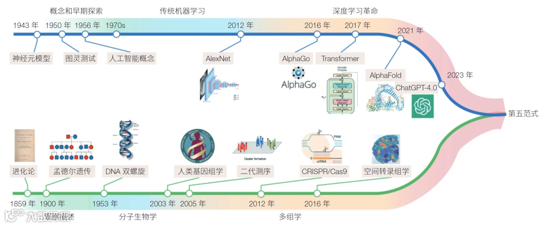 然而,生命系统具有多层面的复杂性,涵盖了从分子、细胞到个体不同层次,以及个体间的种群关系、机体与环境的互作关系,展现出多层级、高维度、高度互联、动态调控的特点。现有的实验科学研究范式在面对如此复杂的生命系统时,往往只能从特定尺度对有限数量的样本进行观察描述和研究,难以全面理解生物网络的运作机制;并且高度依赖人的经验和先验知识对特定生物关系进行探索,难以从大规模、多样性、高维度数据中高效提取隐匿的关联和机制。面对生命现象中复杂的非线性关系和难以预测的特征,人工智能(AI)技术展现出强大的能力,并且已经在蛋白质结构预测、基因调控网络模拟解析方面表现出颠覆性的应用潜力,将生命科学研究由实验科学为主的第一范式推向以人工智能驱动的生命科学研究新范式——第五范式(图1)。