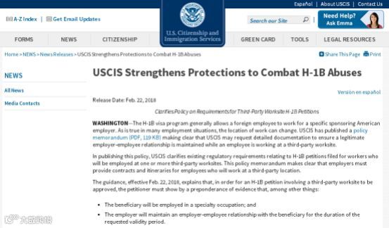 2018年2月22日,美国移民局提出针对H-1B签证的新审查要求,列出更加明确清晰的资料清单。在这份22日生效的声明中提到,在涉及第三方工作机构的H-1B申请中,申请人必须有足够的证据证明其工作职位的专业性,以及在移民局要求时间段内,保持合法雇佣关系的证明。同时,如申请人需被雇主派到第三方公司工作,必须提供非常具体及详细的第三方公司工作内容、时间安排等,因此今年可能会有更多人在申请H-1B时被要求补件。