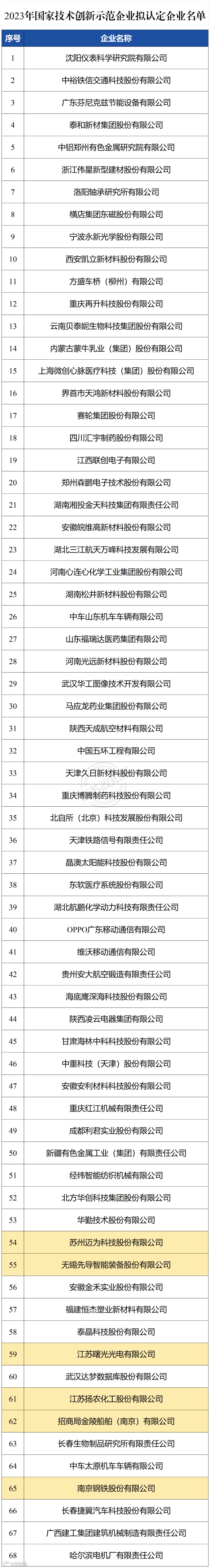 根据《工业和信息化部办公厅关于组织开展2023年国家技术创新示范企业认定及国家技术创新示范企业复核评价工作的通知》(工信厅科函〔2023〕260号),经企业自主申报、地方和央企组织推荐以及专家评审,拟认定沈阳仪表科学研究院有限公司等 68 家企业为国家技术创新示范企业。