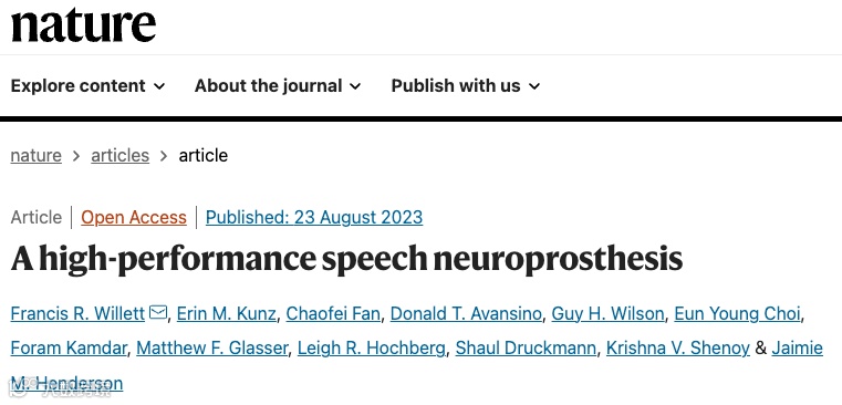 2023年8月,Francis Willett 团队将这项研究以:A high-performance speech neuroprosthesis 为题,发表在了 Nature 期刊。