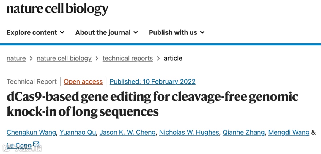 2022年2月,斯坦福大学丛乐团队在 Nature Cell Biology 期刊发表了题为:dCas9-based gene editing for cleavage-free genomic knock-in of long sequences 的研究论文。