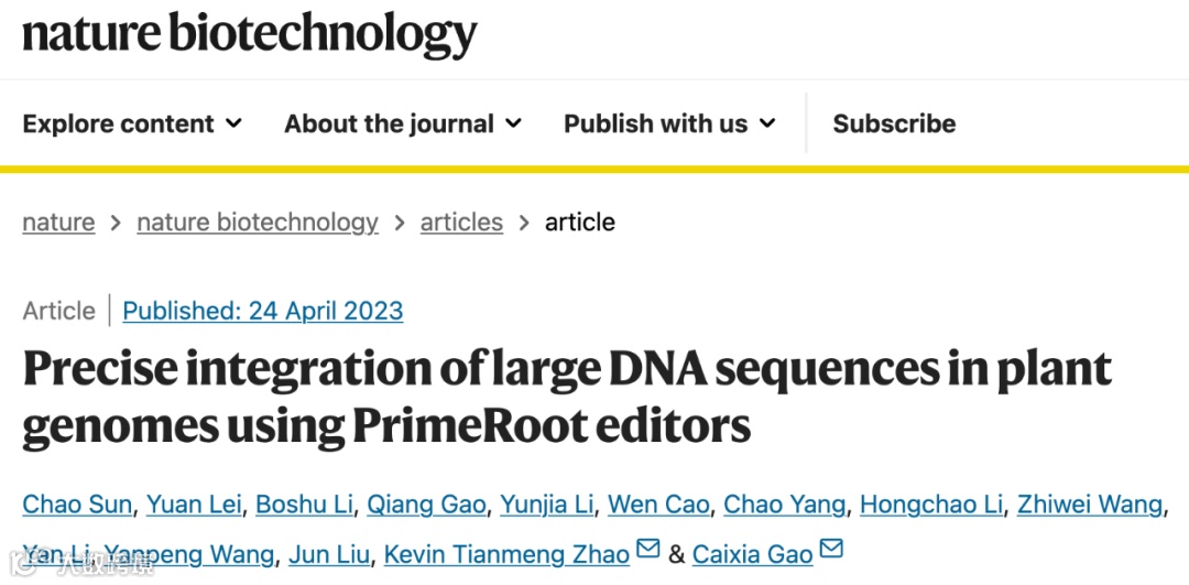 2023年4月,中国科学院遗传与发育生物学研究所高彩霞团队在 Nature Biotechnolgy 期刊发表了题为:Precise integration of large DNA sequences in plant genomes using PrimeRoot editors 的研究论文。