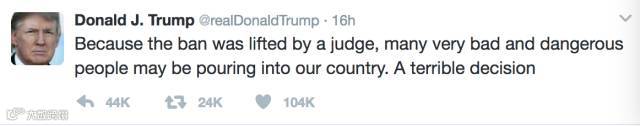 “禁令被一个法官解除,是一个糟透了的决定。会把很多大坏蛋全部放到我们的国家。”